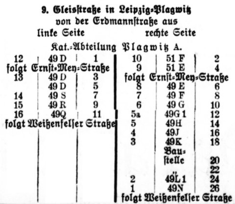 Ursprünglich waren die Häuser umlaufend nummeriert. Zum 1. März 1912 erhielten alle Häuser neue Nummern, so dass die heutige Situation entstand (vgl. Bekanntmachung im Leipziger Tageblatt vom 1. Januar 1912, Seite [5]).
