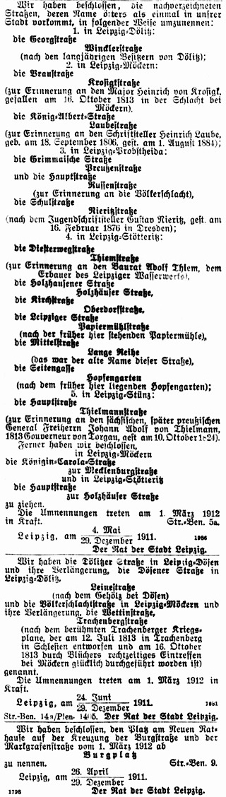 Im Jahr 1905 wurde die Carolastraße im alten Sinne in Königin-Carola-Straße (Königin-Carola-Straße) umbenannt; die Albertstraße erhielt gleichzeitig den Namen »König-Albert-Straße«. Die inzwischen auf der gegenüber liegenden Seite der Hallischen Straße begonnene Fortsetzung nach Norden, die zuletzt als Verlängerte Carolastraße bezeichnet wurde, wurde nun Mecklenburgstraße (Mecklenburgſtraße) benannt, womit an den Prinzen Karl zu Mecklenburg (1785–1837) erinnert wurde, der als preußischer Generalmajor bei den Kämpfen um Möckern während der Völkerschlacht 1813 verwundet wurde.